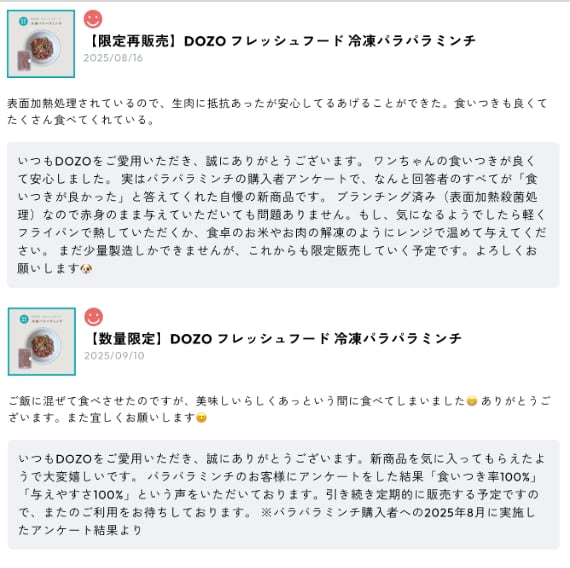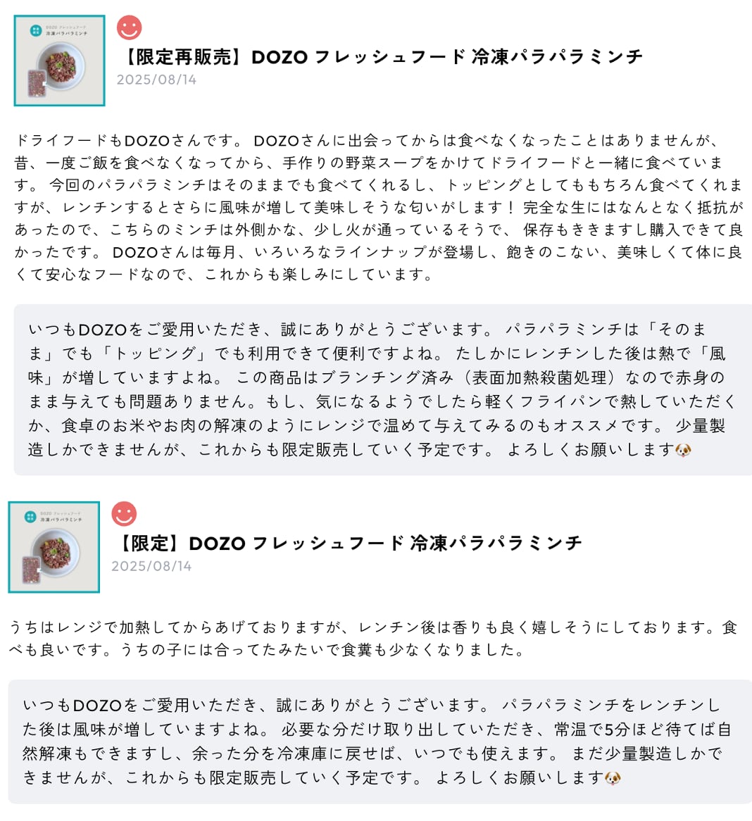 ●ブランチング済みとはいえ、レア状態での食品はデリケートなお腹には便が緩くなる可能性もあります。少量ずつ(いつものDOZOの1/3程度を生食に置き換える等)与えてください。どうしても緩くなる場合は軽く熱を入れてあげてください。