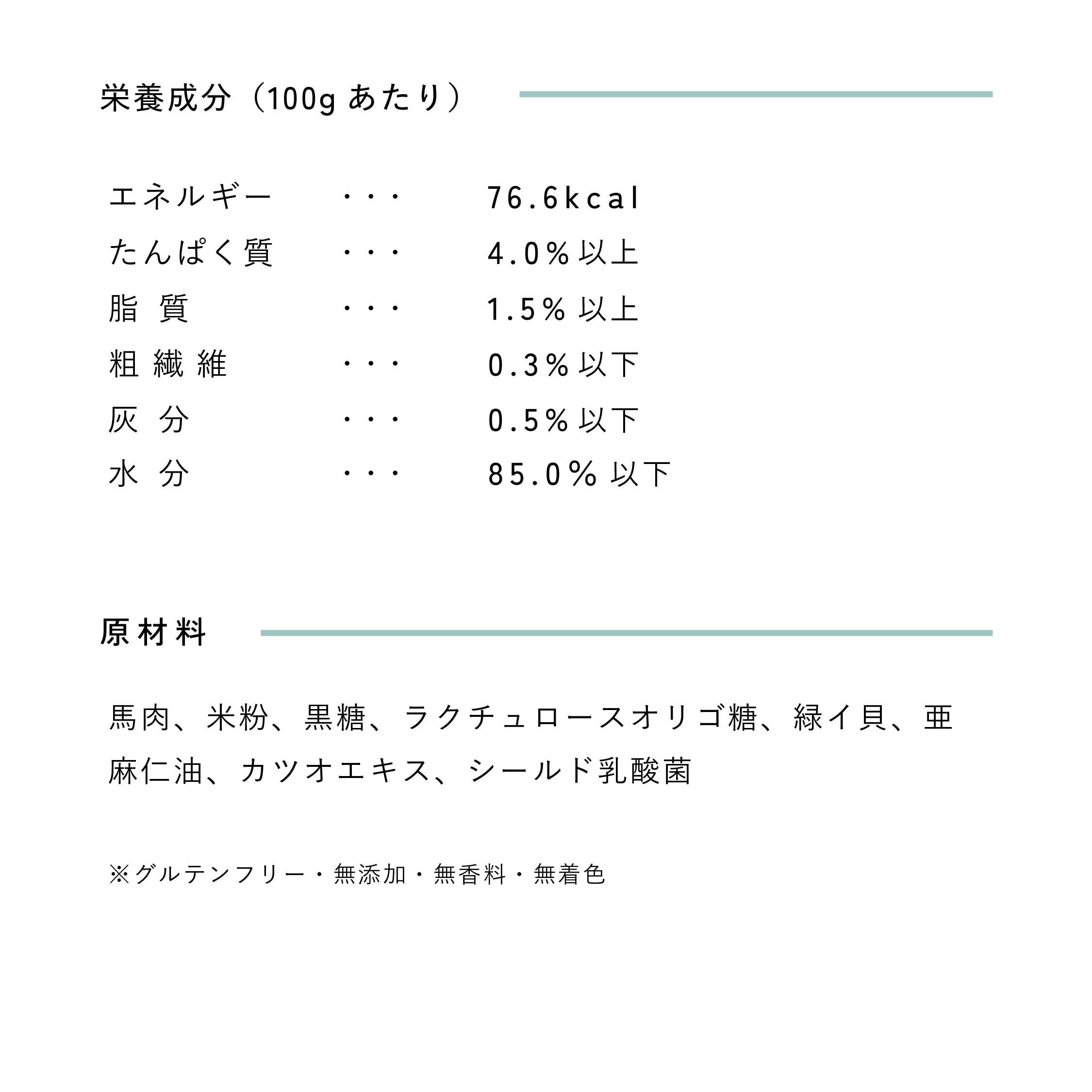 馬肉、米粉、黒糖、ラクチュロースオリゴ糖、緑イ貝、亜麻仁油、カツオエキス、シールド乳酸菌