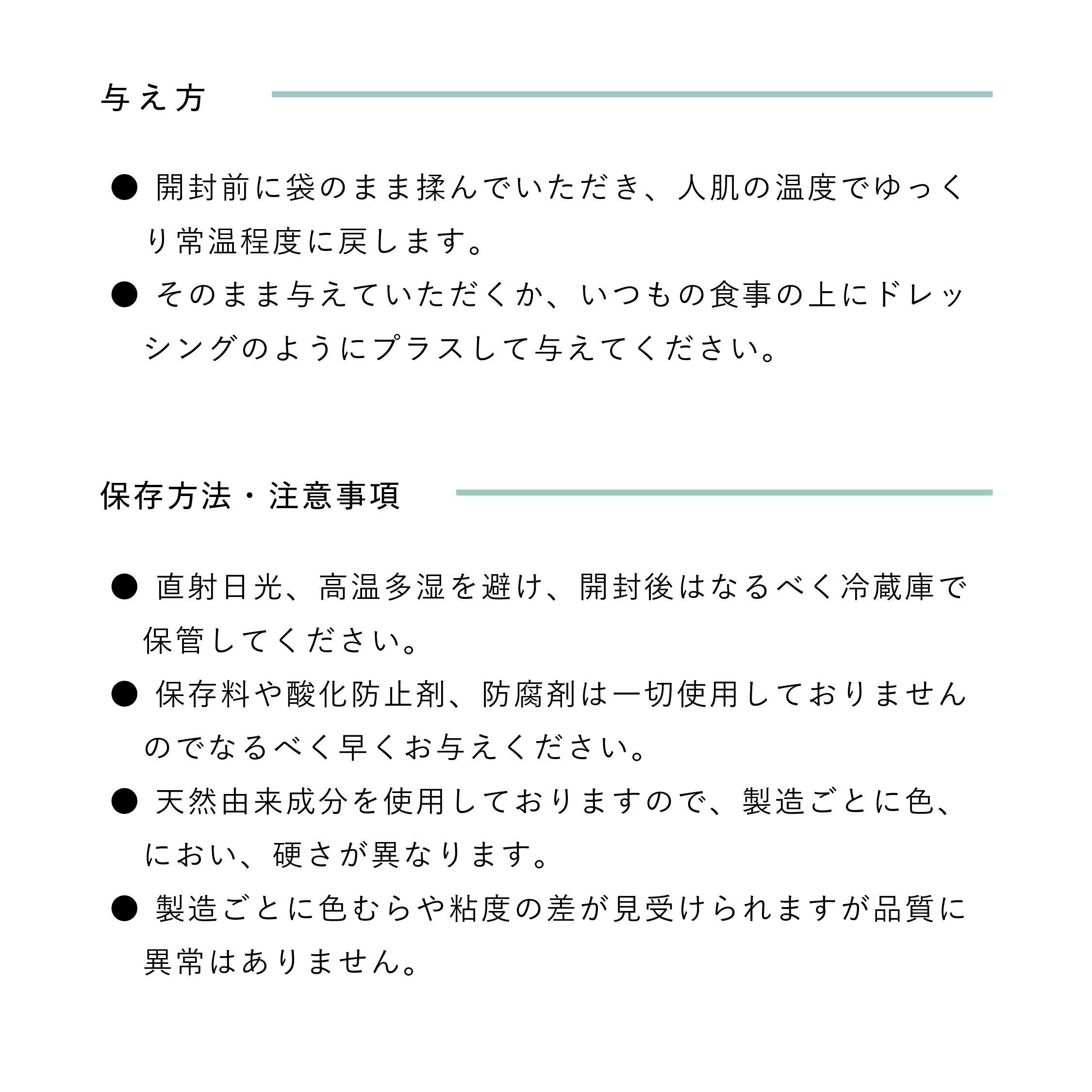 そのまま与えていただくか、いつもの食事の上にドレッシングのようにプラスして与えてください。